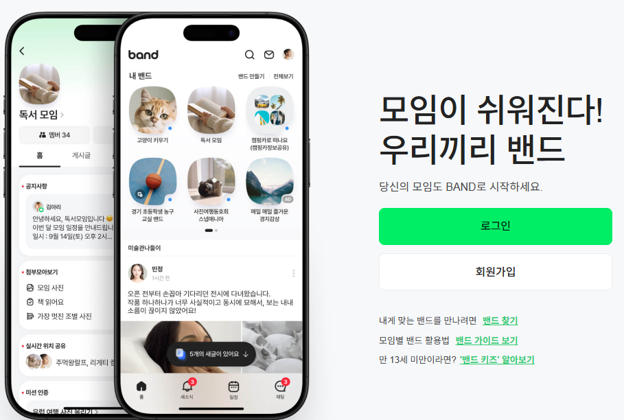 BAND는 2012년 8월 8일 네이버에서 출시한 모임 및 커뮤니티 관리 앱입니다. 단순한 메신저 앱이 아니라, 그룹 단위의 사람들이 모여서 소통하고 정보를 공유하며 관계를 유지할 수 있는 플랫폼으로 설계되었습니다.